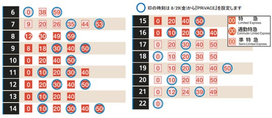 ■2025年8月29日からの大阪梅田駅・京都河原町駅の平日の『PRiVACE』発車時刻表