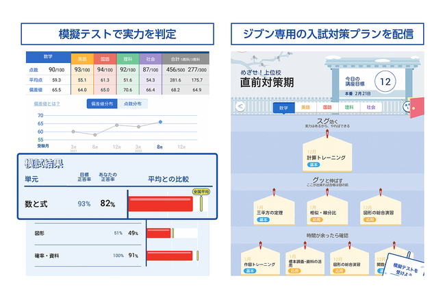 これから高校入試を迎える現中学3年生に向けて、本番さながらの「模擬テスト」を12月、1月、2月に実施し、その結果を分析することで、ジブン専用の入試対策講座を配信します。高校入試直前の今から始めても、理解できていない部分や志望高校合格に向けて不足している箇所をカバーし、効率的に対策ができます。