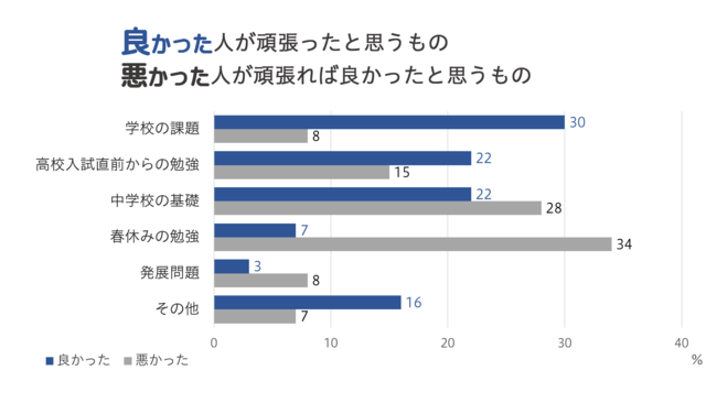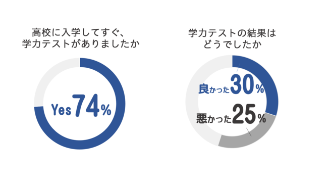 全国の高校1~3年生にアンケートを実施したところ、過半数の74%が「高校に入学してすぐ学力テストがあった」と回答しました。その内、テスト結果が良かった人が最も頑張ったのは「学校の課題(30%)」「高校入試直前からの勉強(22%)」「中学校の基礎(22%)」でした。一方で、テスト結果が悪かった人が最も頑張れば良かったと回答したのは「春休みの勉強(34%)」「中学校の基礎(28%)」でした。この結果から、学力テストで良い結果を出すには、高校入試前からいち早く勉強に取りかかり、こつこつと学校の課題や中学校の基礎を頑張ることが秘訣のようです。