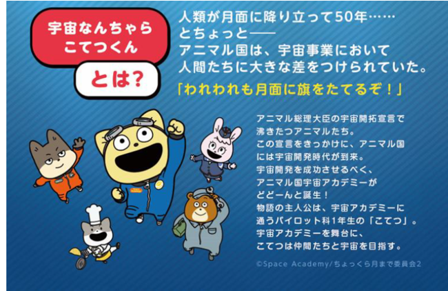 「こねずみ」「ごきげんぱんだ」など、かわいらしくユーモラスなキャラクターを描く、大人気クリエイター・にしむらゆうじによるWEBまんがを原作としたTVアニメ。毎週木曜午後6時40分から、NHK Eテレにて全国放送中。物語の主人公「こてつ」は、宇宙飛行士になることを夢見て、宇宙アカデミーへ入学。同じクラスでエリートの「ニコ」、ロケット研究をしている「ルー」、宇宙でのおもてなしを勉強する「ひかる」、宇宙一の料理人を目指す「おたま」。宇宙アカデミーを舞台に、こてつたちは仲間たちと宇宙を目指す。