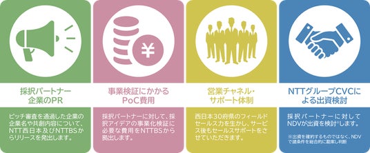 本プログラムでは、NTT西日本グループのアセットと応募企業のイノベーティブなプロダクトなどを組み合わせた事業共創をめざします。エントリーいただいた企業から、NTTBSにて書類選考を実施し、通過した企業(5社予定)によるピッチを実施します。その中から、NTTBSの事業との共創親和性が高い事業アイデアを採択し、共創検討を実施します。共創にあたっての実証実験予算等は、必要に応じてNTTBSにて負担します。また、採択パートナーの要望に応じてNDVが出資を検討します。