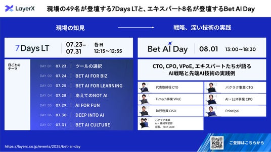 株式会社LayerX(本社:東京都中央区、代表取締役CEO 福島良典、以下「LayerX」)は、2025年8月1日(木)に開催するAIカンファレンス「Bet AI Day」に向けたカウントダウンイベント「7Days LT」を、本日7月23日(火)より開始します。