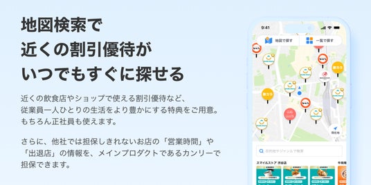 「カンリー福利厚生」は、スマートフォンアプリを通じて、従業員が現在位置から利用可能な割引優待を即座に検索し、何度でも利用できる次世代型の福利厚生サービスです。