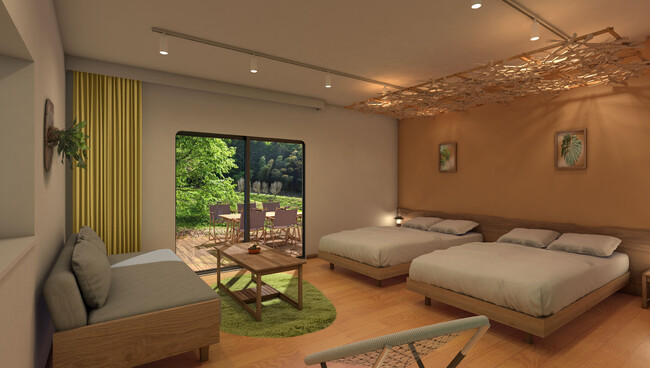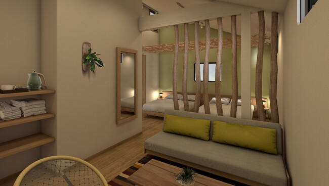 「ミューの森」の民が暮らした家をイメージしたオリジナルデザインです。広々リビングルームにダイニングテーブルも設置。6名さままでのグループでのお泊まりに最適です。冷暖房完備で快適にお過ごしいただけます。
