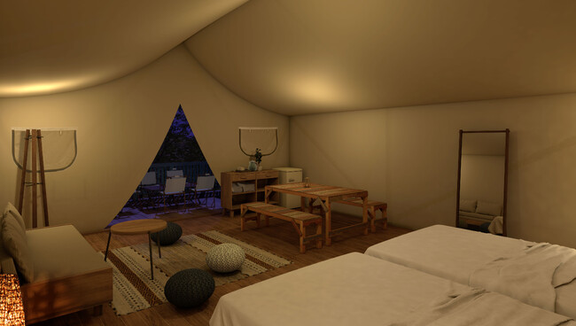 森に囲まれたグランピングエリアにある特別なテント。