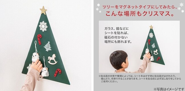 ツリー型シートとオーナメント9個のセットです。シートにマグネットオーナメントをくっつけて飾り付けしていただけます。ガラス、鏡などにシートを貼れば、磁石の付かない場所にも飾れます。