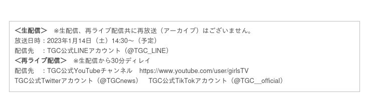 ■TGC公式LINEアカウントにて全編無料生配信、YouTube・Twitter・TikTokにて再ライブ配信、