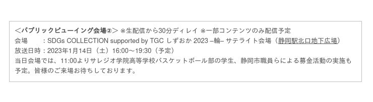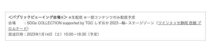 TGC公式YouTubeチャンネル・Twitter・TikTokにて再ライブ配信(30分ディレイ)、さらに同日開催を予定している連携イベント「SDGs COLLECTION supported by TGC しずおか 2023 –輪–」ステージゾーン(ツインメッセ静岡 西館プロムナード)および、静岡駅北口地下広場ではパブリックビューイングの実施も決定しました。TGCしずおかの熱狂をリアル会場だけでなく全国にお届けします!