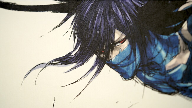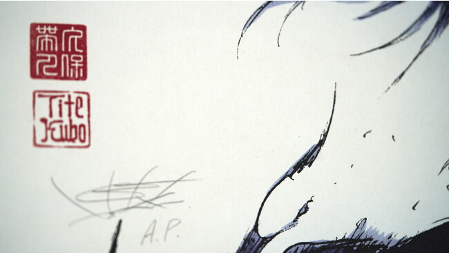 プリントに作家・久保帯人のサインと押印。作品は桐箱におさめ、蓋裏に筆で墨書。NFTブロックチェーンサービス連携販売証明書と繋がるNFCタグシールを添付しています。