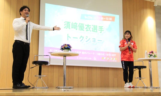 後半の須崎選手とトミドコロさんのトークショーでは、あらためて地元・松戸に帰ってきたという想いを込めて、「ただいまーっ!」の声とともに須崎選手がステージに再登場。会場からの「おかえりーっ!」の温かい声で迎えられ、同じ松戸市出身のトミドコロさんと“松戸ジモトーク”で盛り上がりました。