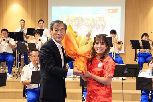 生で演奏を聴き、小学生の時に吹奏楽部に所属していた須崎選手は、「本当にすばらしい演奏と歌声に、心が震えました。この曲は私のレスリング人生と重なるところがいっぱいあって、演奏を聴いて希望をもらいました。本当にありがとうございました!」と感慨深い“いまの気持ち”を会場の観客に伝えました。