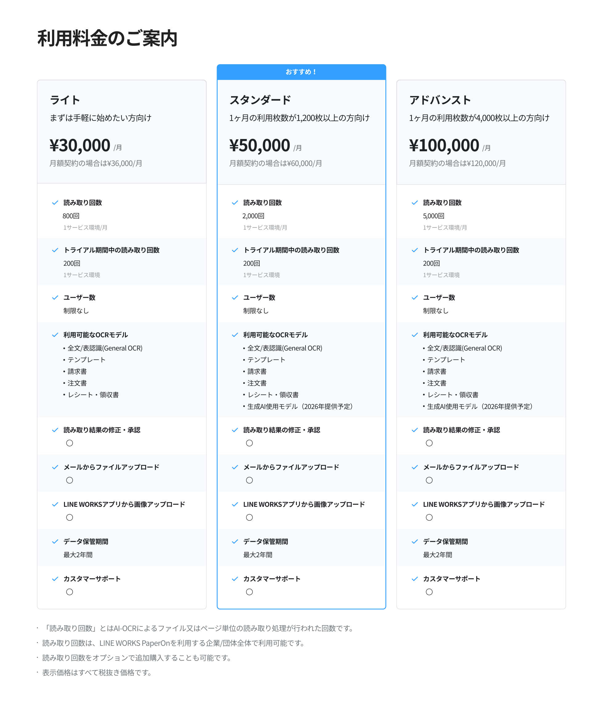 「LINE WORKS PaperOn」とは、紙帳票の読み取りから、修正・データ変換・システム連携・保管までをひとつのツールで対応可能な文書処理業務サービスです。現在提供している「LINE WORKS OCR」では、文書の読み取りに特化していますが、「LINE WORKS PaperOn」は、文書の読み取りだけでなく、必要に応じて内容を自動で修正、補足することが可能となります。
