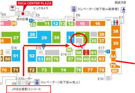 愛知県名古屋市中村区椿町6番9号先 エスカ地下街エスカレーターを降りて 2列目の通りを右に曲がってください。