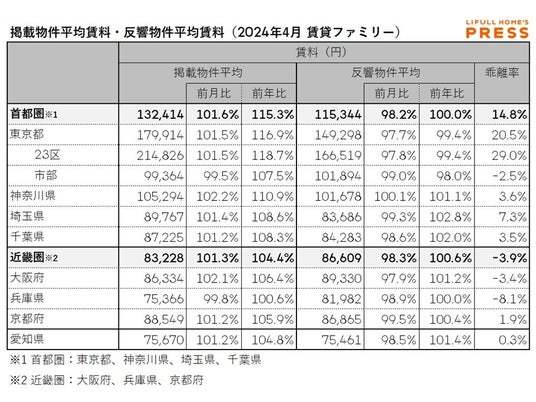 2024年4月の首都圏ファミリー向き賃貸物件の掲載平均賃料は13万2,414円(前月比101.6%・前年比115.3%)、反響平均賃料は11万5,344円(前月比98.2%・前年比100.0%)、近畿圏ファミリー向き賃貸物件の掲載平均賃料は8万3,228円(前月比101.3%・前年比104.4%)、反響平均賃料は8万6,609円(前月比98.3%・前年比100.6%)となった。