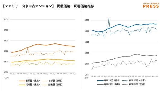 2024年4月の首都圏ファミリー向き中古マンションの掲載平均価格は3,955万円(前月比99.6%・前年比93.7%)、反響平均価格は3,517万円(前月比101.1%・前年比102.9%)、近畿圏ファミリー向き中古マンションの掲載平均価格は2,629万円(前月比100.4%・前年比97.3%)、反響平均価格は2,391万円(前月比102.6%・前年比97.5%)となった。