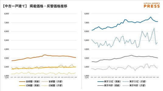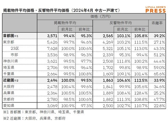 2024年4月の首都圏中古一戸建ての掲載平均価格は3,571万円(前月比99.4%・前年比95.3%)、反響平均価格は2,565万円(前月比103.1%・前年比105.8%)、近畿圏中古一戸建ての掲載平均価格は2,494万円(前月比100.0%・前年比99.5%)、反響平均価格は1,863万円(前月比104.6%・前年比112.5%)となった。