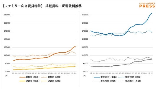 東京都では、東京23区ファミリー向き賃貸物件の掲載平均賃料は21万4,826円(前月比101.5%・前年比118.7%)、反響平均賃料は16万6,519円(前月比97.8%・前年比99.4%)、東京市部ファミリー向き賃貸物件の掲載平均賃料は9万9,364円(前月比99.5%・前年比107.5%)、反響平均賃料は10万1,894円(前月比99.0%・前年比98.0%)となった。
