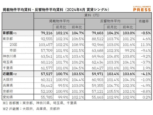 2024年4月の首都圏(東京都、神奈川県、埼玉県、千葉県)シングル向き賃貸物件の掲載平均賃料は7万9,216円(前月比102.1%・前年比104.7%)、反響平均賃料は7万9,603円(前月比104.2%・前年比103.0%)、近畿圏(大阪府、兵庫県、京都府)シングル向き賃貸物件の掲載平均賃料は5万7,527円(前月比100.7%・前年比103.5%)、反響平均賃料は5万9,971円(前月比103.4%・前年比103.6%)となった。