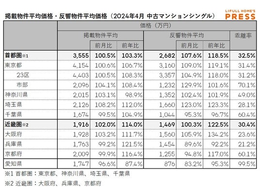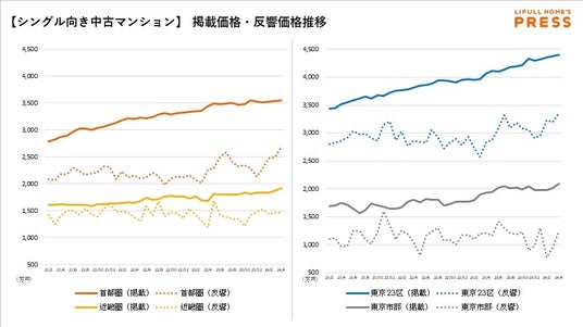 2024年4月の首都圏シングル向き中古マンションの掲載平均価格は3,555万円(前月比100.5%・前年比103.3%)、反響平均価格は2,682万円(前月比107.6%・前年比118.5%)、近畿圏シングル向き中古マンションの掲載平均価格は1,916万円(前月比102.0%・前年比114.0%)、反響平均価格は1,469万円(前月比100.3%・前年比122.5%)となった。