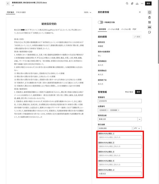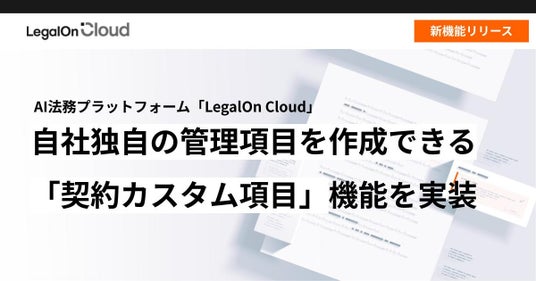 株式会社LegalOn Technologies(本社:東京都渋谷区 代表取締役 執行役員・CEO:角田 望)が提供する、法務業務全体を包括的に支援するAI法務プラットフォーム「LegalOn Cloud」(https://www.legalon-cloud.com/ )は、締結版契約書に自社独自の管理項目を作成できる「契約カスタム項目」機能を実装しました。本機能の実装により、「契約担当者」や「契約開始日」などの基本項目の他に、「店舗情報」や「地域」など、自社独自の管理情報をもとに契約書を管理することができるようになります。