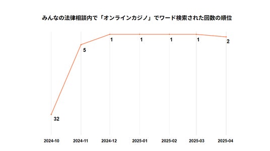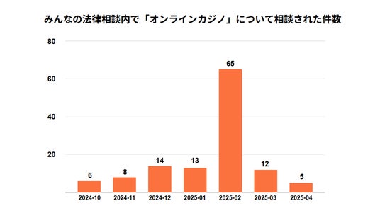 「みんなの法律相談」において、「オンラインカジノ」に関して利用者が相談した件数を集計したところ、著名人の利用が大きく報じられた2025年2月に急増しており、直近で最多の65件の相談があったことがわかりました。