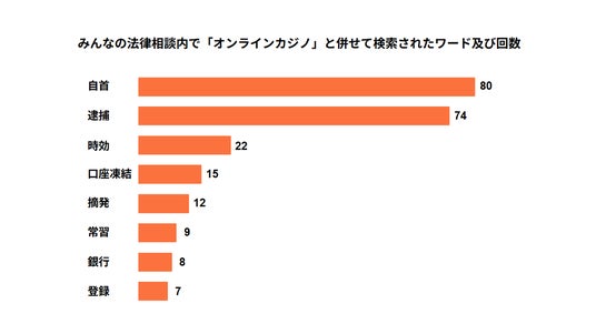「みんなの法律相談」において、「オンラインカジノ」と併せて検索されたワードの検索回数を機械的に抽出したところ、「自首」が80回で最多という結果になりました。「逮捕」が74回、「時効」が22回、「口座凍結」が15回と続きました。