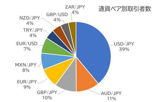 通貨ペア別取引者数のトップ10は、USD/JPY(米ドル/円)・AUD/JPY(豪ドル/円)・GBP/JPY(ポンド/円)・EUR/JPY(ユーロ/円)・MXN/JPY(メキシコペソ/円)・EUR/USD(ユーロ/米ドル)・TRY/JPY(トルコリラ/円)・NZD/JPY(NZドル/円)・GBP/USD(ポンド/米ドル)・ZAR/JPY (南アフリカランド/円)の順。