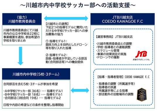 2020年設立、設立10年以内に埼玉県川越市をホームタウンにJリーグ加盟を目指すCOEDO KAWAGOE F.Cを運営するCOEDO KAWAGOE F.C株式会社(埼玉県川越市、代表取締役 有田和生)は、パートナー企業であるJTB川越支店とともに受託した「埼玉県新たな地域クラブ活動実証事業」を、令和6年3月をもちまして全て終了したことをお知らせいたします。