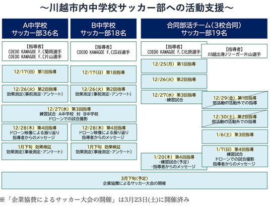 今回の実証事業では、川越市教育委員会の協力のもと、川越市内中学校(5校・3チーム)のサッカー部への活動支援を行いました。事業の目的・活動内容は以下の5点です。