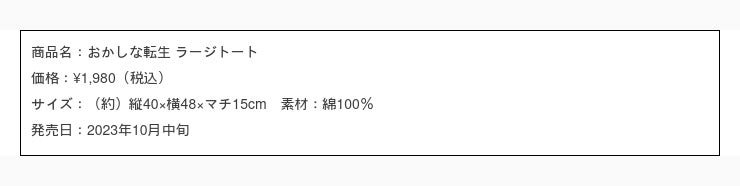 『おかしな転生』をデザインした大容量トートバッグ。エコバッグとしても活躍!イベントやお買い物で活躍する大型サイズ。※裏面は無地
