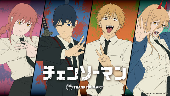 サンキューマートでの商品展開は今回が初となり、主人公「デンジ」や「ポチタ」、デビルハンターの「マキマ」「早川アキ」「パワー」を中心としたデザイン商品を全31アイテム展開します。