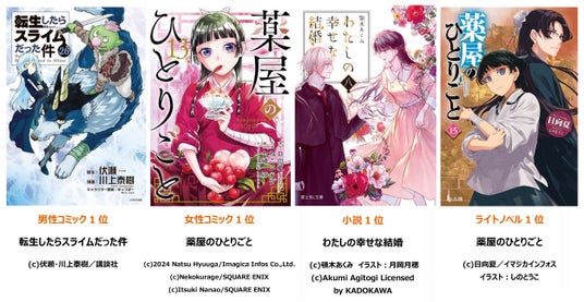 「auブックパス」の男性コミック、女性コミック、小説、ライトノベルなど、11ジャンルの2024年上半期ランキングを発表! 男性コミック1位は、TVアニメ第3期も好評放送中の異世界転生の名作『転生したらスライムだった件』。また、シリーズ累計3,300万部突破、TVアニメ第2期の放送も決定した後宮謎解きエンタテインメント『薬屋のひとりごと』は、ライトノベル1位、コミカライズ版も女性コミック1位にランクインしています。さらに、映画化・アニメ化でも話題の和風ファンタジー『わたしの幸せな結婚』が小説1位を獲得するなど、メディアでも話題の各作品が1位に輝きました。詳しいランキングは、「auブックパス」特設ページをご覧ください。