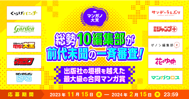 KADOKAWA、講談社、小学館、スクウェア・エニックス、集英社など10社の計10編集部が一斉審査に参加するマンガ賞で、大賞に選出された方には賞金200万円を授与します。また、受賞の有無を問わず、応募作品はすべてスカウトの対象となり、10社10誌のさまざまな編集者から、スカウトの声がかかるチャンスがあります。「君のマンガは、誰の心を掴むだろう。」をキャッチコピーに、出版社や漫画誌のジャンルの垣根を越え、キラリと光る才能を発掘すべく審査いたします。