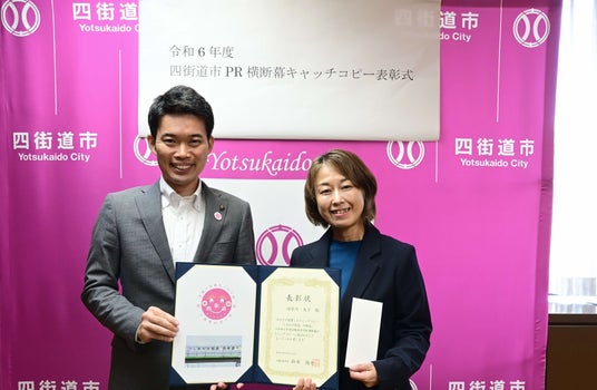 上り線のキャッチコピー「しあわせ街道 四街道」を提案した田草川さんは「四街道という4つの道が、それぞれしあわせにつながり、様々な背景を持つ人々にとっても穏やかに暮らせる街であり続けてほしいという願いを込めて作りました。」と話していました。