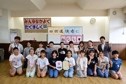 四街道市PR横断幕キャッチコピー表彰式が、9月24日(火)に行われ、キャッチコピー提案者の、田草川 友子(たくさがわ ともこ)さん、みそら小学校5年1組の皆さんに表彰状を授与しました。