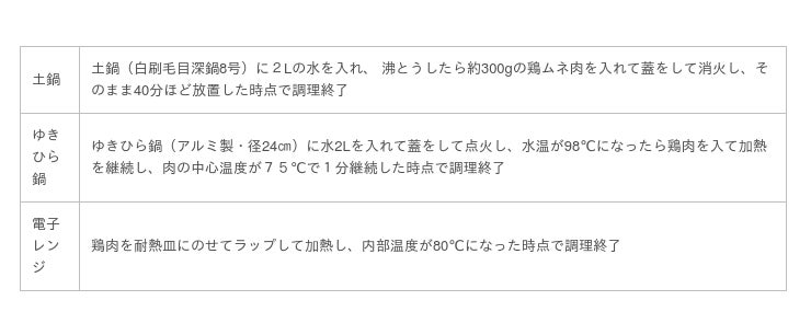 ゆきひら鍋と電子レンジを使って次のように調理を行い、調理前後での鶏ムネ肉の重量変化を土鍋料理のものと比較しました。