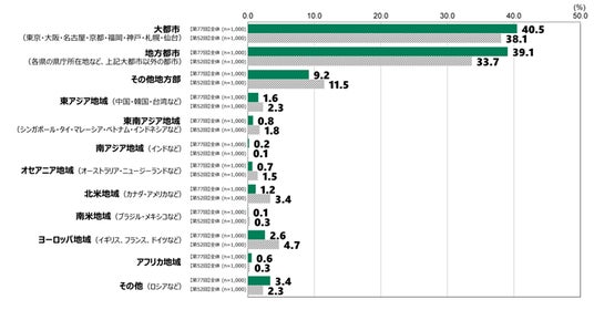 価値観については、人生において大切にしたいこと(※1)において、「家族」が7ポイント減少して52.6%となりトップから転落し、「自身の好きなことややりたいこと・趣味」がトップとなったほか、「友達」や「恋愛」が減少しました。増加傾向が見られた項目は「資産の形成」等であり、自分自身をより重視する傾向がうかがえました。また、将来暮らしたい場所は、日本国内を選択した割合が3年前より5ポイント増加し88.8%となりました。