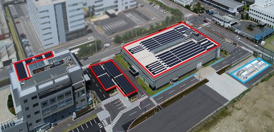 CNラボの空撮写真(水色枠:CNラボ、赤色枠:太陽光発電装置)