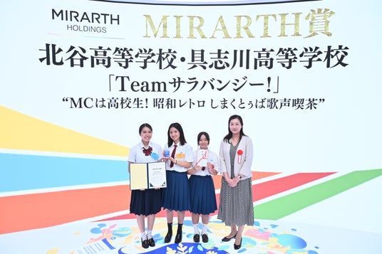 当社は企業賞として、沖縄県立北谷高等学校・具志川高等学校「Teamサラバンジー!」のアクションプラン「MCは高校生!昭和レトロ しまくとぅば歌声喫茶」に“MIRARTH賞”を贈りました。消滅危機言語である「しまくとぅば」を次世代につなぐ取り組みや、地域社会との関係性を深めることで「無縁社会」で起こる様々な社会問題解決の糸口にするアイデアが、当社の掲げる長期ビジョン「地域社会のタカラであれ。」と親和性が高く、地元の文化を継承したいという想いや、地域の人と人をつなぐ取り組みに共感いたしました。