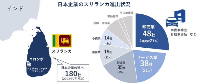 スリランカに進出している日本企業は、2022年7月時点で180社判明した。進出先としては、スリランカ最大都市のコロンボ周辺に多く集中していた。業種別では、最も多いのが卸売業の48社で、全体の4分の1を占める。特に、スリランカ向けに中古車輸出を手掛ける「中古車卸」や、アフターパーツなどの自動車部品卸が多くみられた。次いでサービス業(38社)、製造業(35社)などが多く、同国で進むインフラ開発を背景に道路舗装などの建設業(19社)の割合も高かった。総じて、スリランカ国内向けの販売拠点としての進出が多いものの、現地向け生産拠点や、南アジア以西の流通拠点として進出するケースが多い。