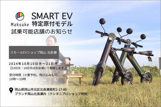 株式会社ブレイズ(愛知県名古屋市、代表取締役:市川秀幸、以下ブレイズ)は、Makuake応援購入プロジェクトにて先日発売した「16歳以上免許不要」の新商品:スマートEV 特定原付モデルが、弊社正規ディーラーの「スモールEVショップ岡山 北長瀬」(岡山県岡山市)にて、2024年10月10日(木)~21日(月)までご試乗いただけますことをお知らせいたします。