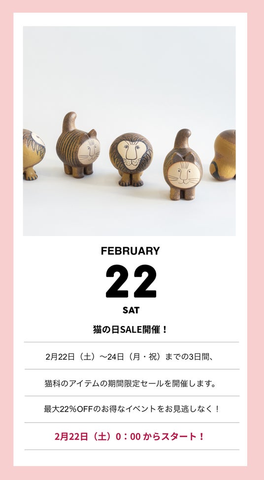 猫の日にちなんで、「猫科」のアイテムを中心に、最大22%OFFになるお得なセールです。