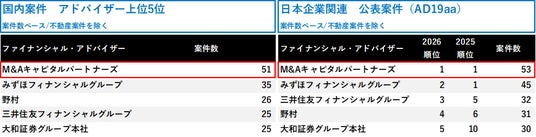 ・1位獲得「日本企業関連 公表案件 (AD19aa) 案件数ベース/不動産案件を除く」