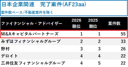 M&Aキャピタルパートナーズ株式会社(東京都中央区・代表取締役社長 中村悟、以降「MACP」)は、LSEG(ロンドン証券取引所グループ)が発表したM&A市場リーグテーブル「日本M&Aレビュー 2026年第1四半期 ファイナンシャル・アドバイザー」における国内M&A業界3部門で圧倒的1位を獲得し、3冠を達成したことをお知らせいたします。