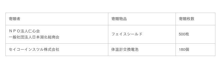 2020-06-17 東京都 フェイスシールド等の寄贈について Tweet ~新型コロナウイルスに関する東京都からのお知らせ~ この度、下記寄贈者から東京都にフェイスシールド等の寄贈がありましたので、お知らせいたします。 記 [表: https://prtimes.jp/data/corp/52467/table/505_1.jpg ] 企業プレスリリース詳細へ PR TIMESトップへ 公式ツイッター Follow @Straightpress 最新情報をTwitterで受け取ろう! 公式フェイスブックページ 最新情報をFacebookで受け取ろう! 前の記事 一覧へ戻る 次の記事