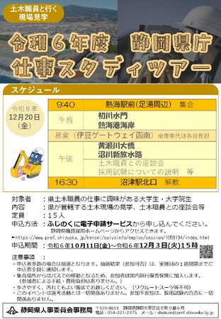 県の専門・技術職員の仕事に興味のある大学生及び大学院生等を対象に、実際に働く現場を見ることで県の仕事の魅力や、公務員のやりがいを伝える現場見学ツアーを実施します!