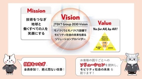 ジェイテクトは、「技術をつなぎ、地球と働くすべての人を笑顔にする」というミッションに基づき、2030年までに目指す姿としてJTEKT Group 2030 Vision「モノづくりとモノづくり設備でモビリティ社会の未来を創るソリューションプロバイダー」を掲げています。
