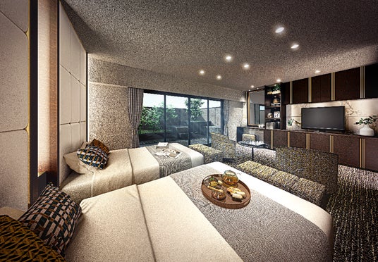 ※掲載のゲストルーム完成予想CGは計画段階の図面を基に描き起こしたもので実際とは異なります。家具・調度品等は変更になる場合があります。また、一部の備品・調度品はCGパース上の表現であり、実際には設置されておりません。実物と質感・色等の見え方が異なる場合があります。植栽は計画段階のもので変更になる場合があります。
