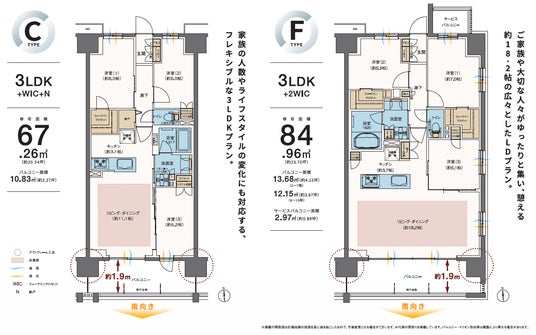 住居専有面積 : 67.26平方メートル ~84.96平方メートル