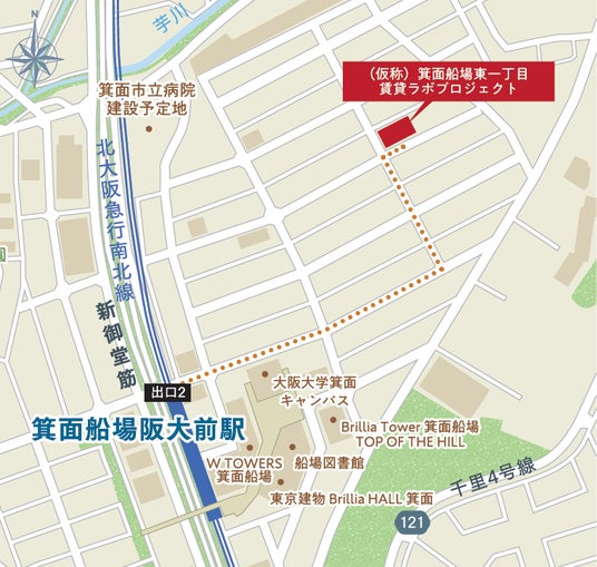 本物件は箕面船場エリア東部、「箕面船場阪大前」駅より徒歩約8分に位置し、ライフサイエンス分野の研究が盛んな大阪大学吹田キャンパスへのアクセスも優れた立地です。